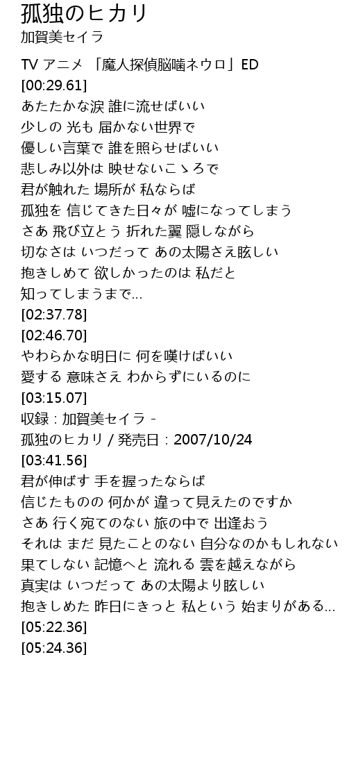 | [03:17.07] | 収録:加賀美セイラ - 孤独のヒカリ/発売日:2007/10/24 |