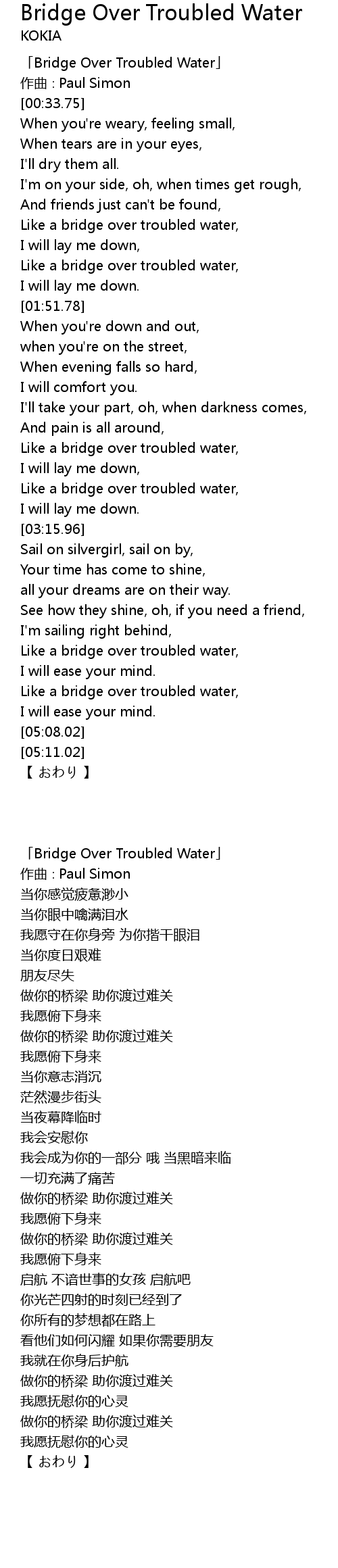 | [00:01.75] | 「Bridge Over Troubled Water」 |
