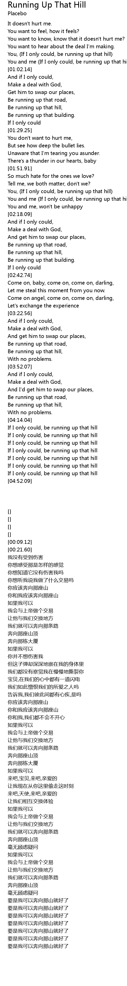 | [00:59.42] | You and me (If I only could, be running up that hill) |