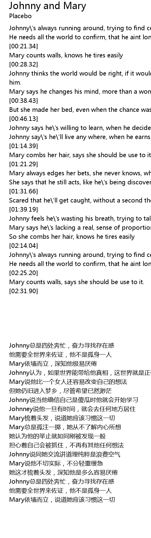 | [01:22.29] | Mary always edges her bets, she never knows, what to think. |