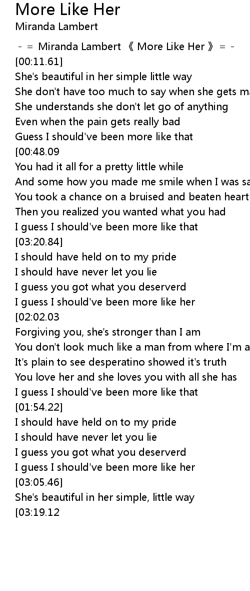 | [00:00.00] | -= Miranda Lambert 《 More Like Her 》=- |