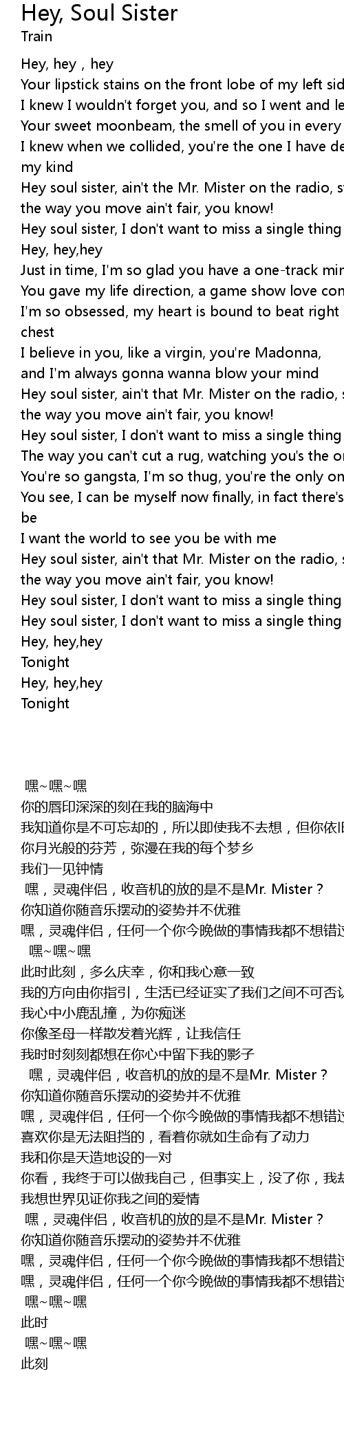 | [02:39.970] | Hey soul sister, ain' t that Mr. Mister on the radio, stereo, |