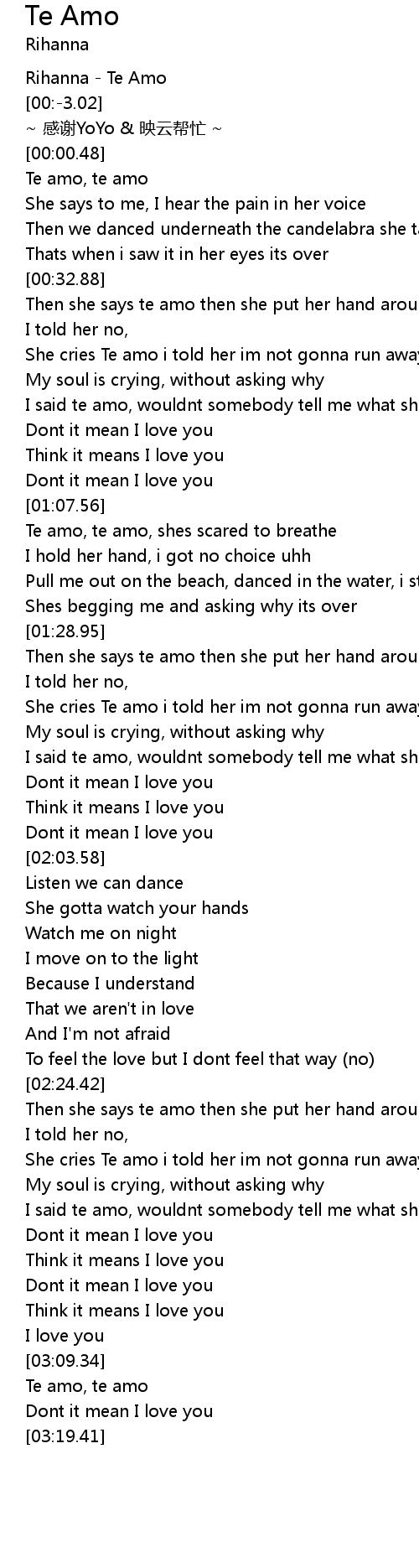 | [00:33.34] | Then she says te amo then she put her hand around my waist |