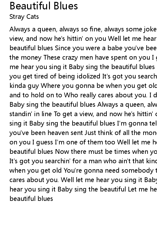 Always a queen, always so fine, always some joker standin' in line To get a view, and now he's hittin' on you Well let me hear you sing it Baby sing the beautiful blues Since you were a babe you've been heaven sent Just think of all the money These crazy men have spent on you I guess I'm one of them too Well let me hear you sing it Baby sing the beautiful blues Now there must be times when you get tired of being idolized It's got you searchin' for a man who ain't that kinda guy Where you gonna be when you get old You're gonna need somebody to have and to hold on to Who really cares about you. I do Well let me hear you sing it Baby sing the beautiful blues Always a queen, always so fine, always some joker standin' in line To get a view, and now he's hittin' on you Well let me hear you sing it Baby sing the beautiful blues I'm gonna tell you since you were a babe you've been heaven sent Just think of all the money These crazy men have spent on you I guess I'm one of them too Well let me hear you sing it Baby sing the beautiful blues Now there must be times when you get tired of being idolized It's got you searchin' for a man who ain't that kinda guy Where you gonna be when you get old You're gonna need somebody to have and to hold on to Who really cares about you. Well let me hear you sing it Baby sing the beautiful Let me hear you sing it Baby sing the beautiful Let me hear you sing it Baby sing the beautiful blues |