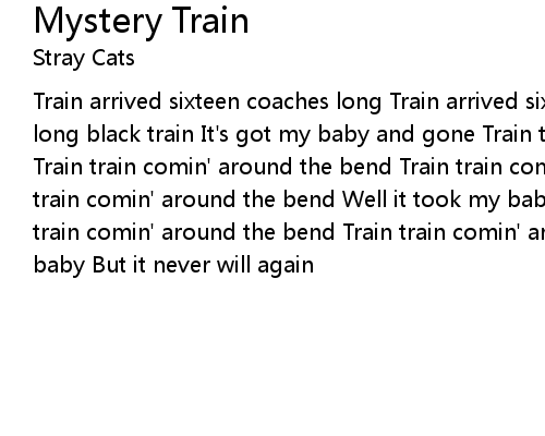 | Train arrived sixteen coaches long Train arrived sixteen coaches long Well that long black train It's got my baby and gone Train train comin' around the bend Train train comin' around the bend Train train comin' around the bend Train train comin' around the bend Well it took my baby But it never will again Train train comin' around the bend Train train comin' around the bend Well it took my baby But it never will again |