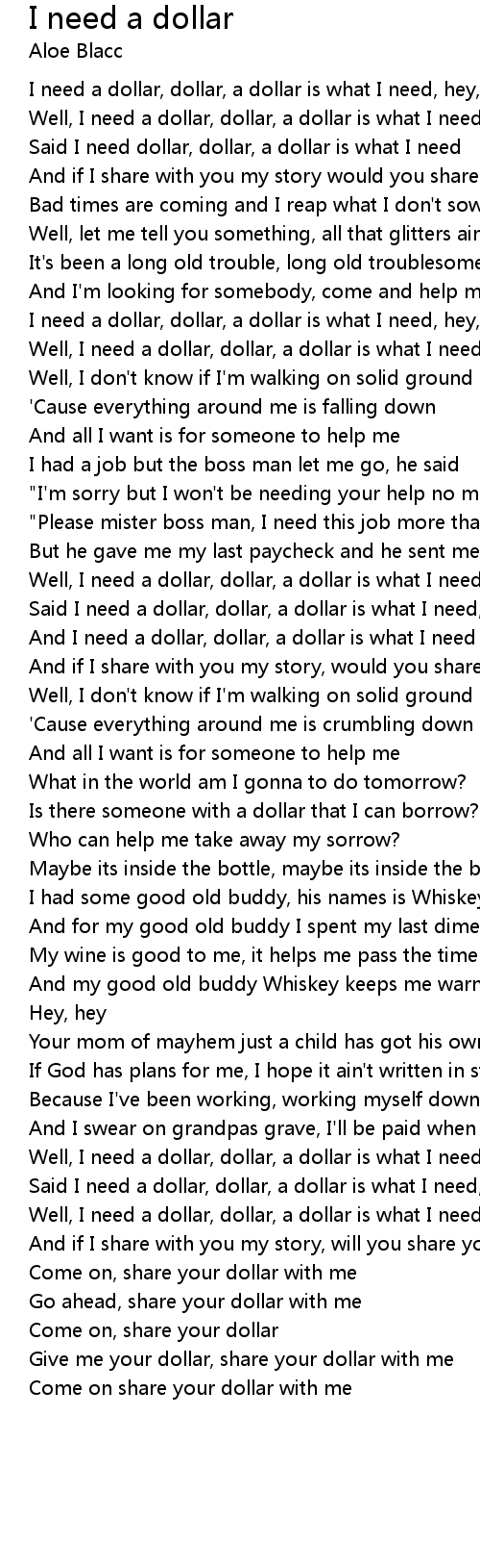Well, I need a dollar, dollar, a dollar is what I need, hey, hey |