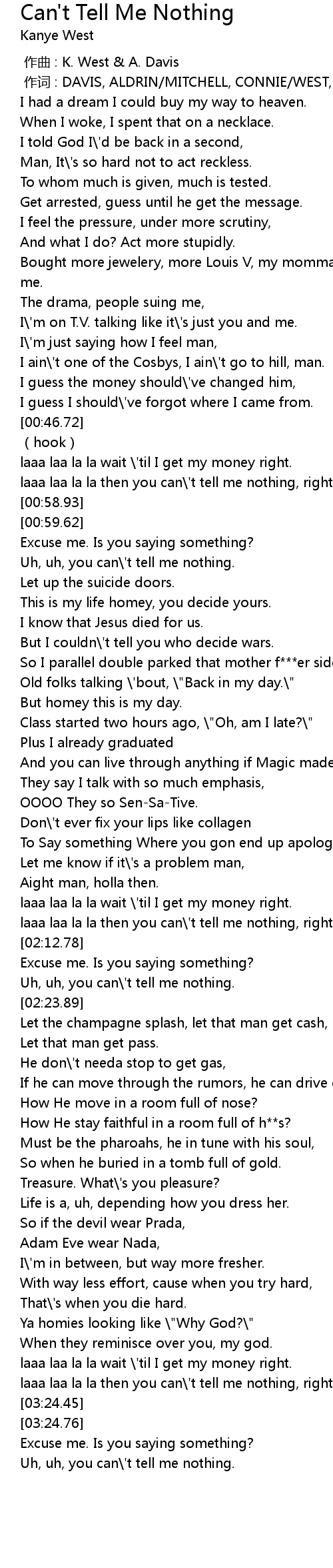| [03:28.88] | Uh, uh, you can\'t tell me nothing. |