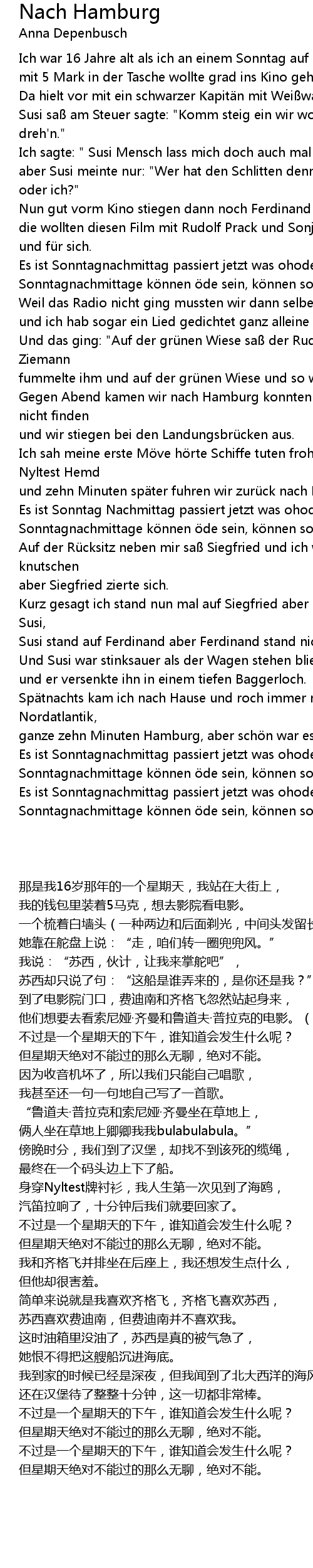 | [01:29.261] | Gegen Abend kamen wir nach Hamburg konnten die verdammte Reeperbahn nicht finden |