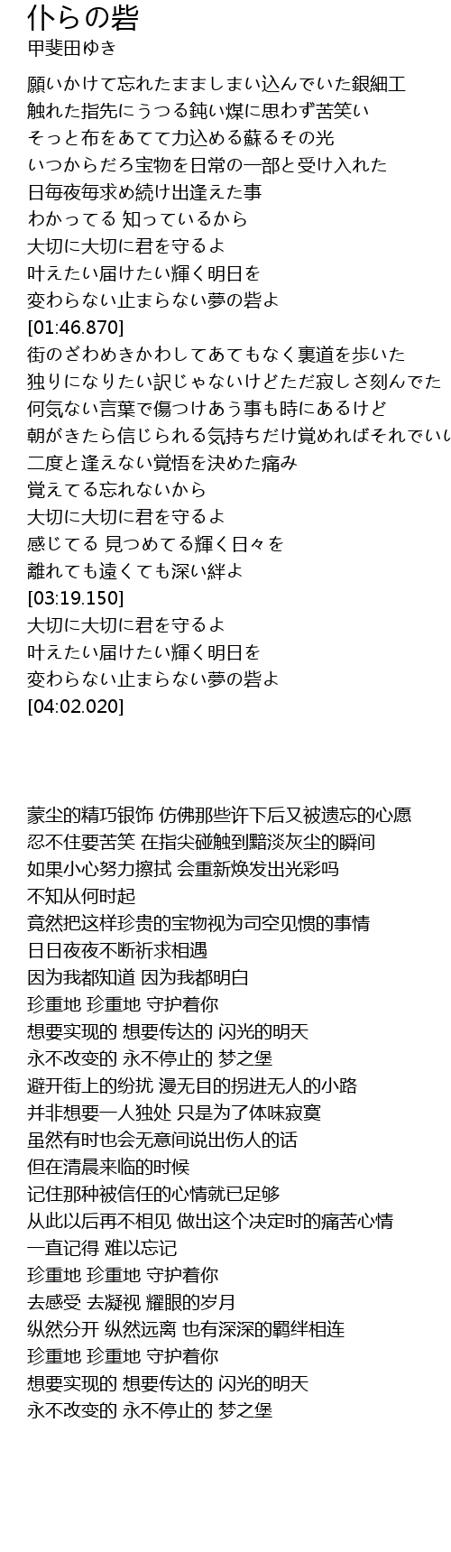 | [03:51.380] | 変わらない止まらない夢の砦よ |