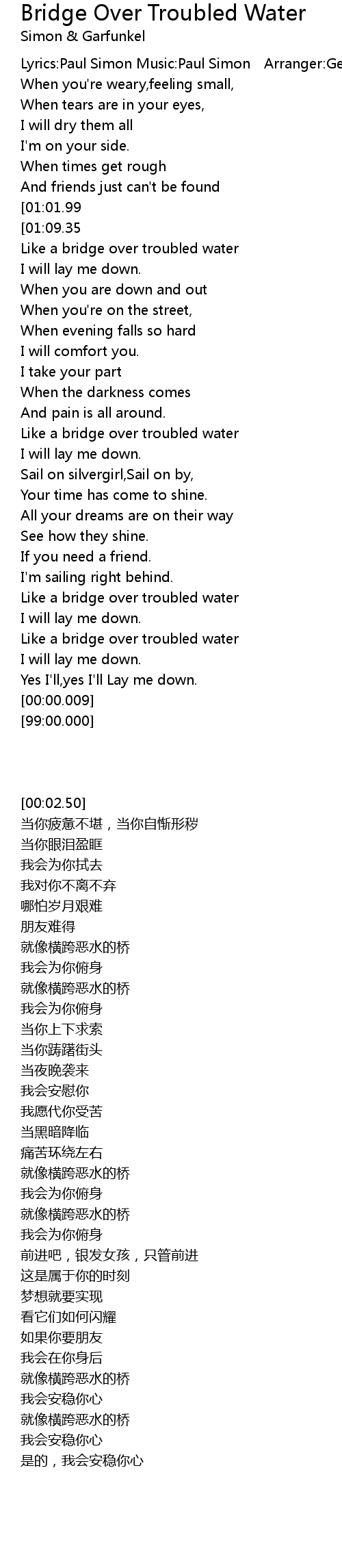 | [02:22.97][01:01.99] | Like a bridge over troubled water |