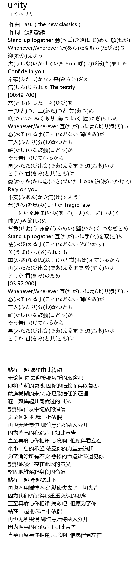 | [03:16.800] | Stand up together 互(たが)いに手(て)を取(と)り |