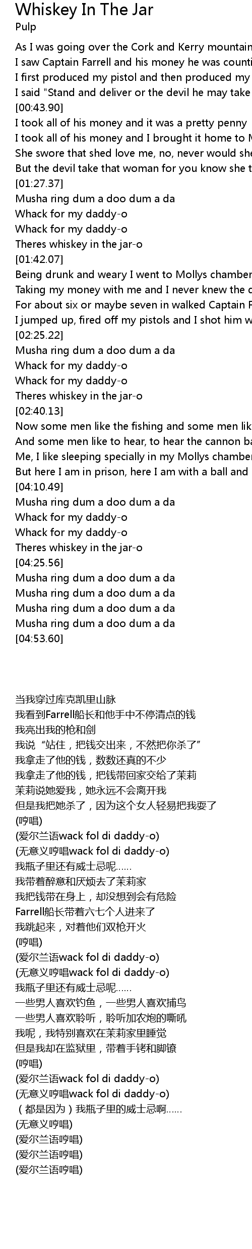 | [04:22.21] | Theres whiskey in the jar-o |