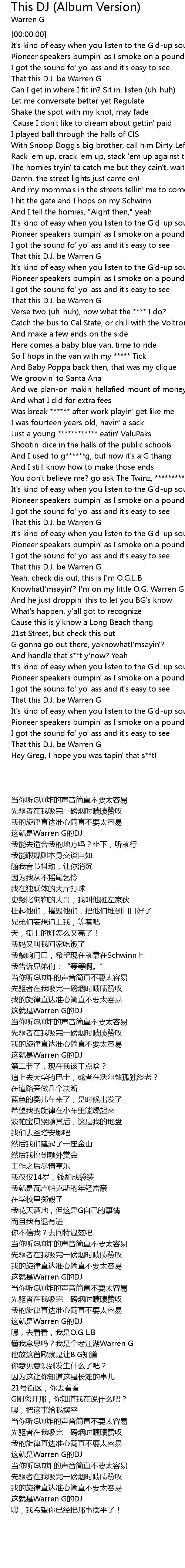 | [02:29.88] | KnowhatI'msayin'? I'm on my little O.G. Warren G |