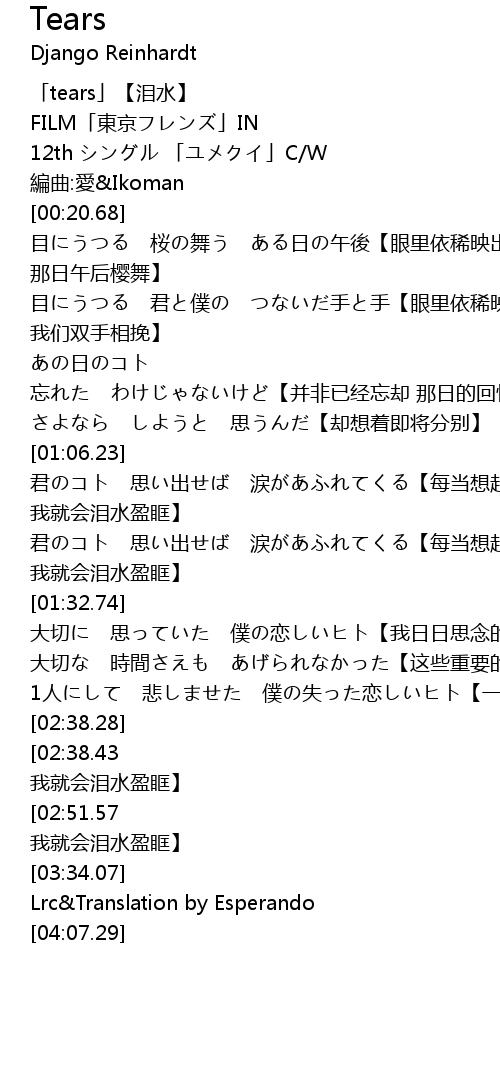 | [03:04.70][02:38.43] | 君のコト 思い出せば 涙があふれてくる【每当想起你 我就会泪水盈眶】 |