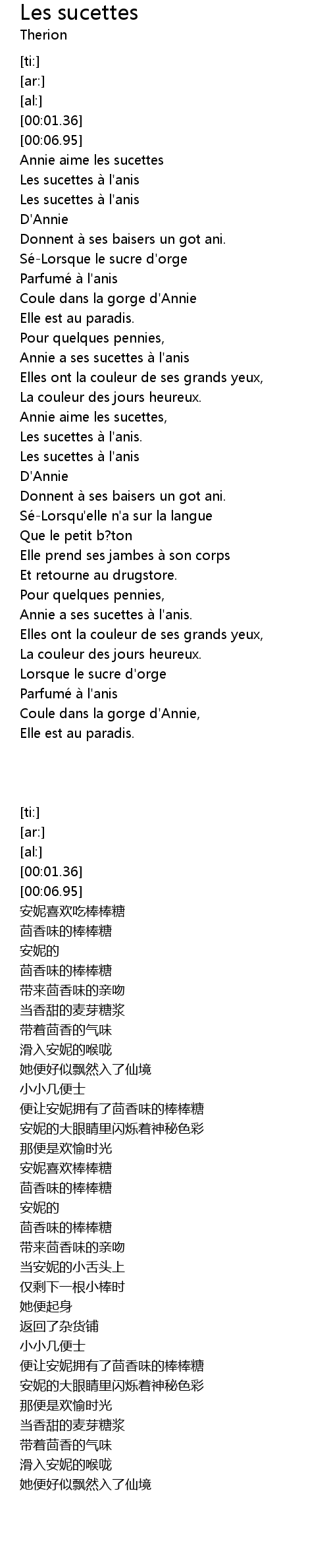 | [00:47.62] | Annie a ses sucettes à l' anis |