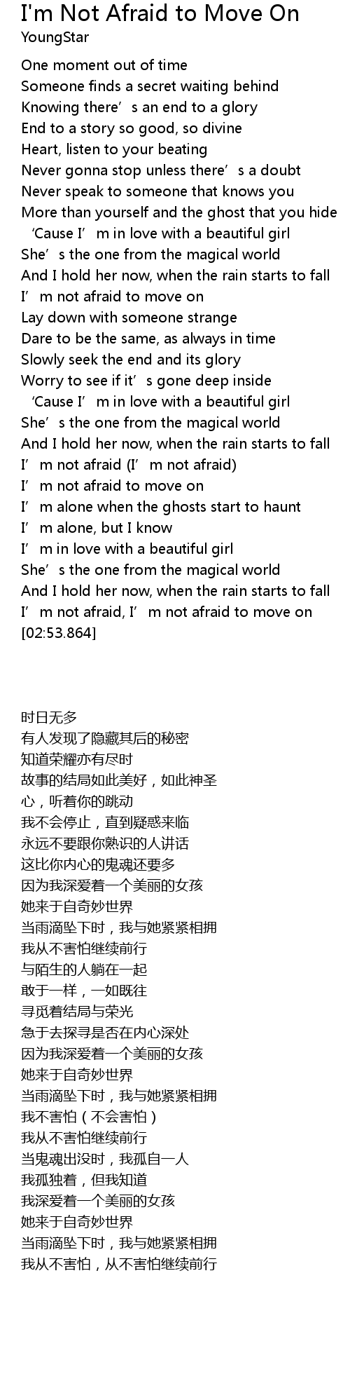 | [02:40.772] | I' m not afraid, I' m not afraid to move on |