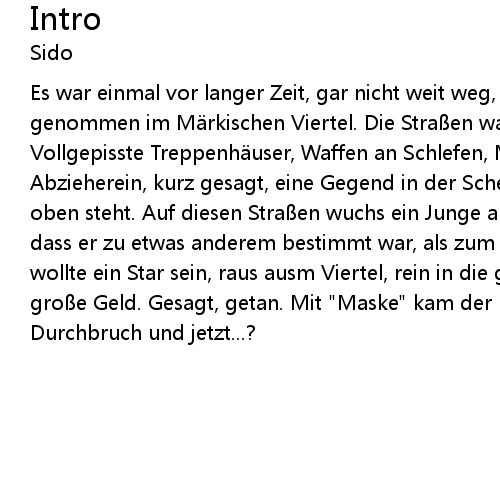 | Es war einmal vor langer Zeit, gar nicht weit weg, ziemlich um die Ecke. Genauer genommen im Märkischen Viertel. Die Straßen warn voller Hass und Gewalt. Vollgepisste Treppenhäuser, Waffen an Schlefen, Messer in Schenkeln, Abzieherein, kurz gesagt, eine Gegend in der Scheiße auf dem Speiseplan ganz oben steht. Auf diesen Straßen wuchs ein Junge auf, dem schnell klar wurde, dass er zu etwas anderem bestimmt war, als zum Gras ticken und Autos knacken. Er wollte ein Star sein, raus ausm Viertel, rein in die große Welt und ran an das große Geld. Gesagt, getan. Mit "Maske" kam der Erfolg, mit "Ich" kam der Durchbruch und jetzt...? |