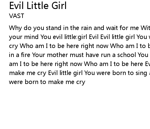 Why do you stand in the rain and wait for me With dark clothes, dark thoughts on your mind You evil little:girl Evil Evil little girl You were born to make me cry Who am I to be here right now Who am I to be here Take my heart and throw it in a fire Your mother must have run a school You were trained to make me cry Who am I to be here right now Who am I to be here Evil little girl You were born to make me cry Evil little girl You were born to sing along Evil little girl You were born to make me cry |