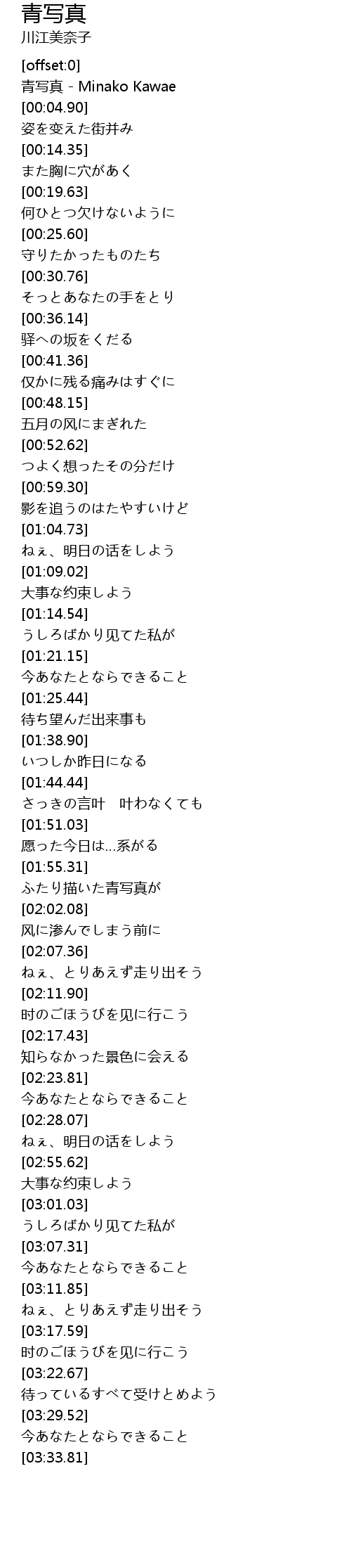 | [00:00.63] | 青写真 - Minako Kawae |