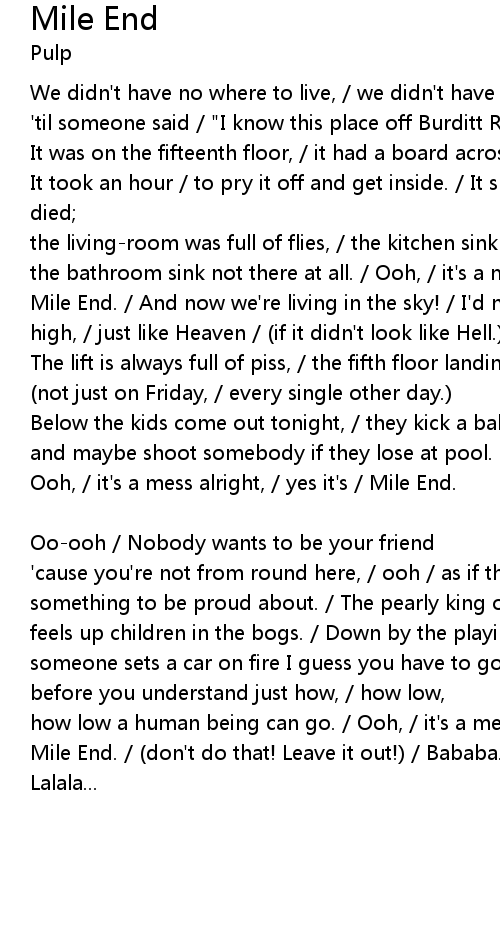 Mile End. / And now we're living in the sky! / I'd never thought I'd live so |