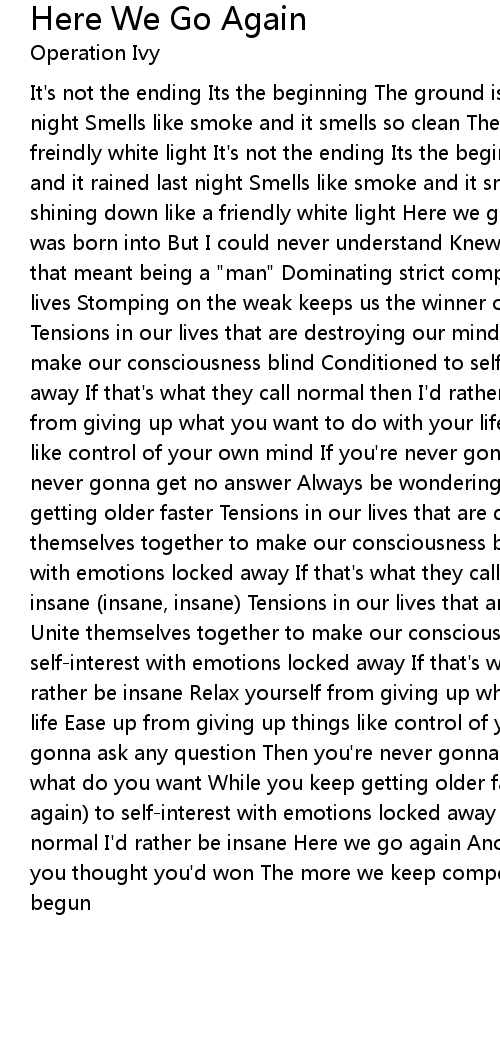It's not the ending Its the beginning The ground is moist and it rained last night Smells like smoke and it smells so clean The sun is shining down like a freindly white light It's not the ending Its the beginning The ground is moist and it rained last night Smells like smoke and it smells so clean The sun is shining down like a friendly white light Here we go again Analyzed the world I was born into But I could never understand Knew I never wanted to grow up if that meant being a "man" Dominating strict competition is the meaning of our lives Stomping on the weak keeps us the winner of the battle in our minds Tensions in our lives that are destroying our minds Unite themselves together to make our consciousness blind Conditioned to self-interest with emotions locked away If that's what they call normal then I'd rather be insane Relax yourself from giving up what you want to do with your life Ease up from giving up things like control of your own mind If you're never gonna ask any question Then you're never gonna get no answer Always be wondering what do you want While you keep getting older faster Tensions in our lives that are destroying our minds Unite themselves together to make our consciousness blind Conditioned to self-interest with emotions locked away If that's what they call normal then I'd rather be insane (insane, insane) Tensions in our lives that are destroying our minds Unite themselves together to make our consciousness blind Conditioned to self-interest with emotions locked away If that's what they call normal then I'd rather be insane Relax yourself from giving up what you want to do with your life Ease up from giving up things like control of your own mind If you're never gonna ask any question Then you're never gonna get no answer Always be wondering what do you want While you keep getting older faster Conditioned (here we go again) to self-interest with emotions locked away If that's what they call normal I'd rather be insane Here we go again Another test of manhood just when you thought you'd won The more we keep competing The more the battle has just begun |