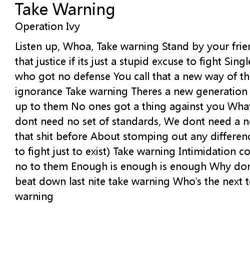 Listen up, Whoa, Take warning Stand by your friends, wrong or right Can't call that justice if its just a stupid excuse to fight Single out and attack the ones who got no defense You call that a new way of thinking i call it regression to ignorance Take warning Theres a new generation coming And we really gotta stand up to them No ones got a thing against you What youve got something to prove We dont need no set of standards, We dont need a new set of rules Man,heard all that shit before About stomping out any difference We say stand together! (not to fight just to exist) Take warning Intimidation coming And we really gotta say no to them Enough is enough is enough Why dont you just ease up I saw another beat down last nite take warning Who's the next to hit the ground tonite take warning |