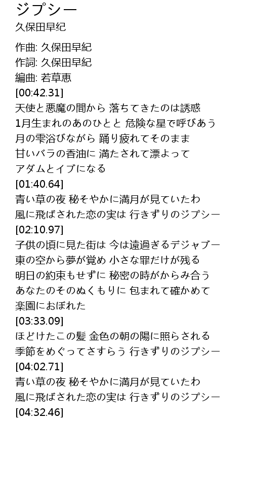 | [00:14.41] | 作詞: 久保田早紀 |