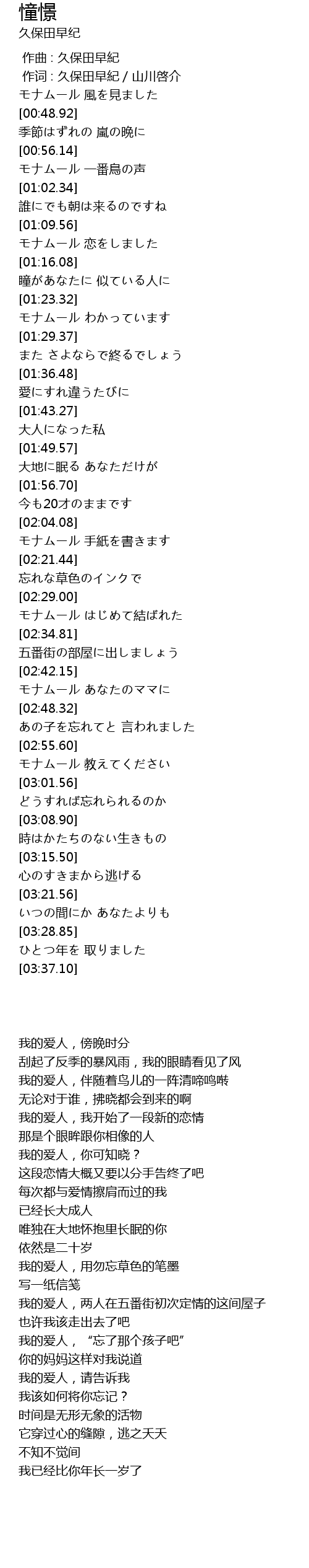 | [00:01.00] | 作词 : 久保田早紀/山川啓介 |