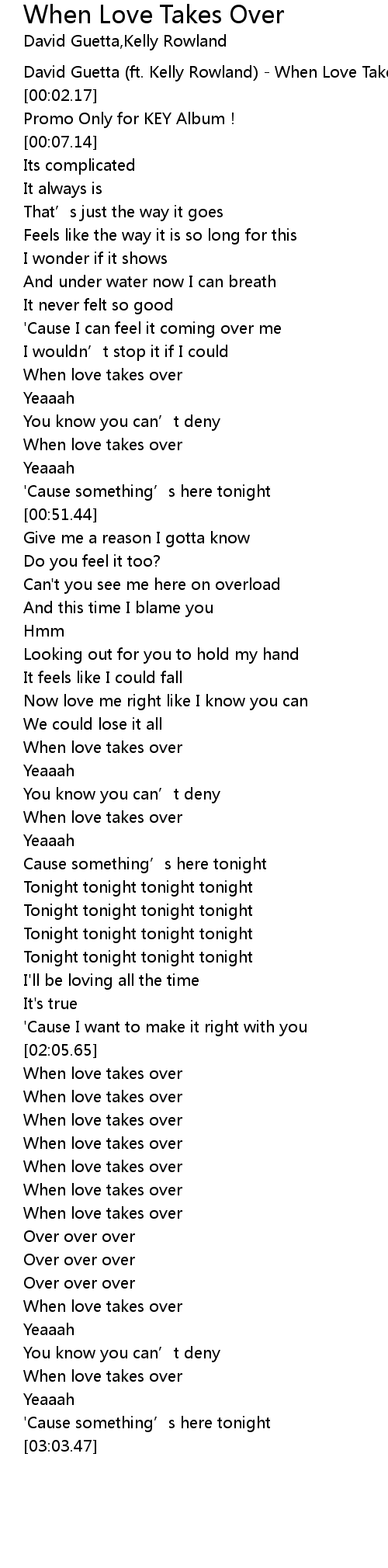 | [00:00.59] | David Guetta (ft. Kelly Rowland) - When Love Takes Over |
