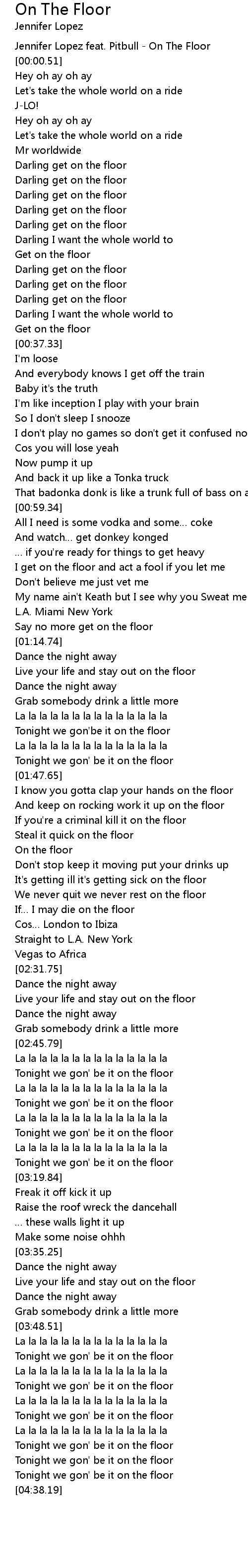 | [00:00.00] | Jennifer Lopez feat. Pitbull - On The Floor |
