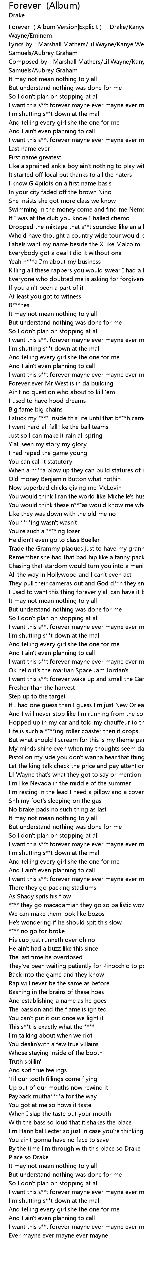 | [00:00.100] | Forever (Album Version|Explicit) - Drake/Kanye West/Lil Wayne/Eminem |