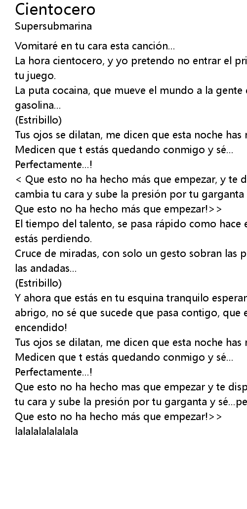 | Que esto no ha hecho mas que empezar y te disparas, masticas la cancio n, cambia tu cara y sube la presio n por tu garganta y se... perfectamente! | |