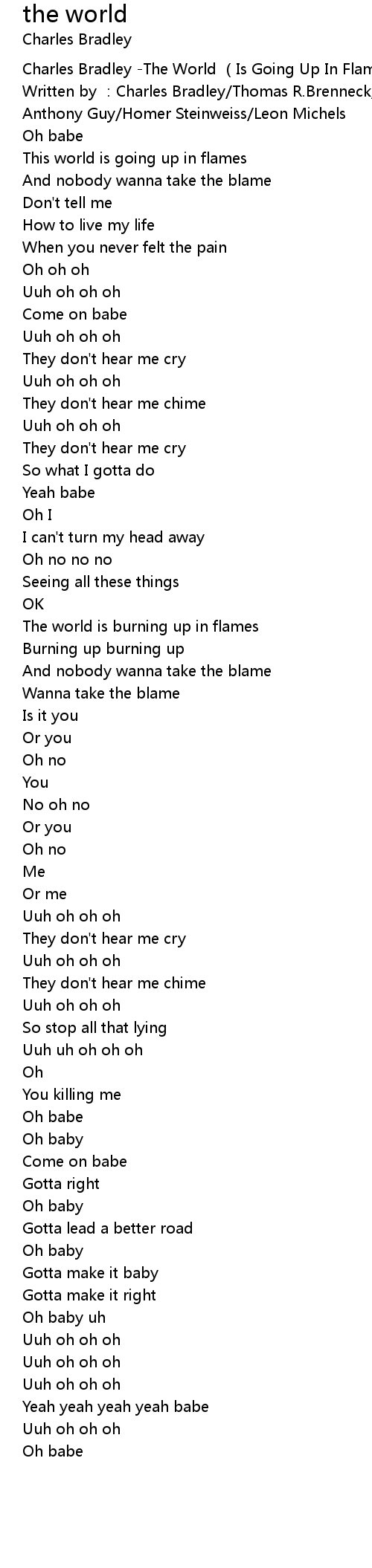 | [00:00.218] | Charles Bradley -The World (Is Going Up In Flames) |