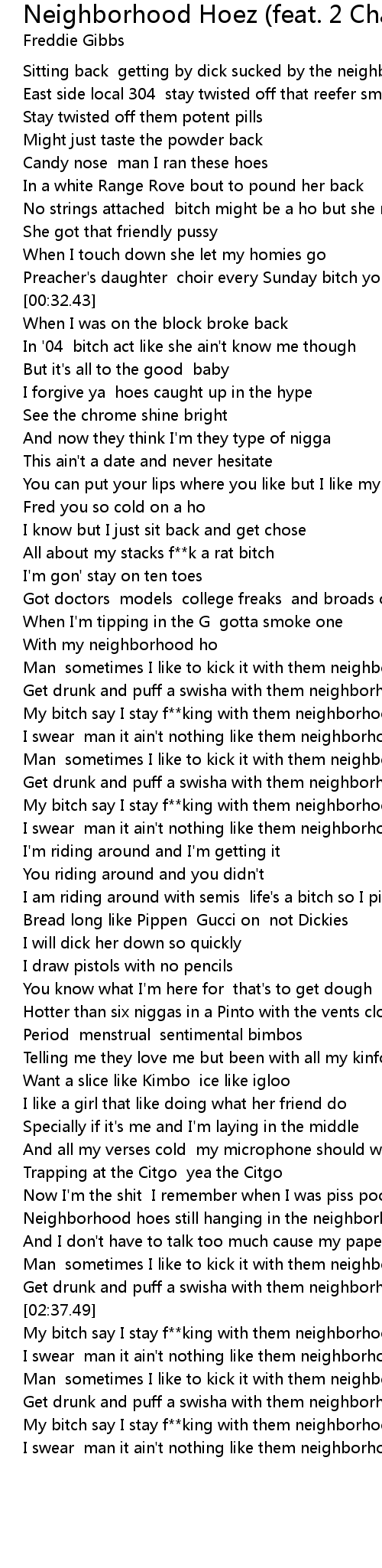 My bitch say I stay f**king with them neighborhood hoes |