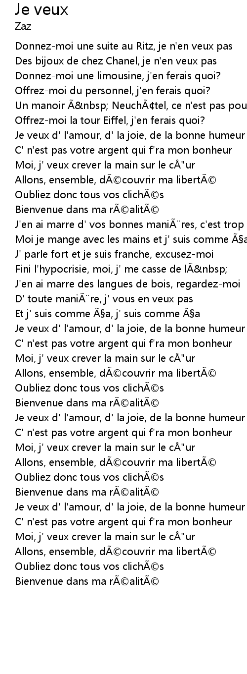 | Je veux d' l'amour, d' la joie, de la bonne humeur | |