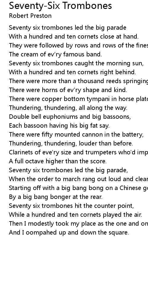 Seventy six trombones caught the morning sun, |