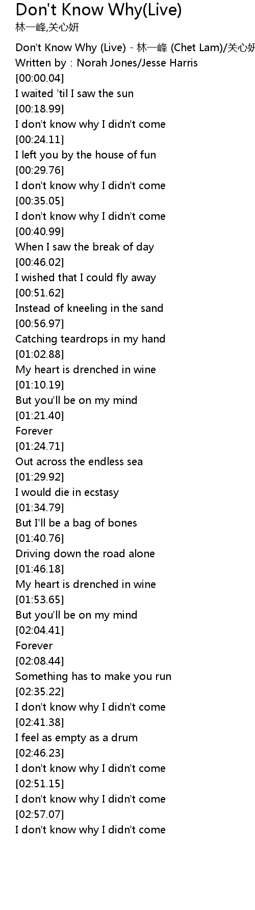 | [00:00.01] | Don' t Know Why Live lín yī fēng Chet Lam guān xīn yán Jade Kwan |
