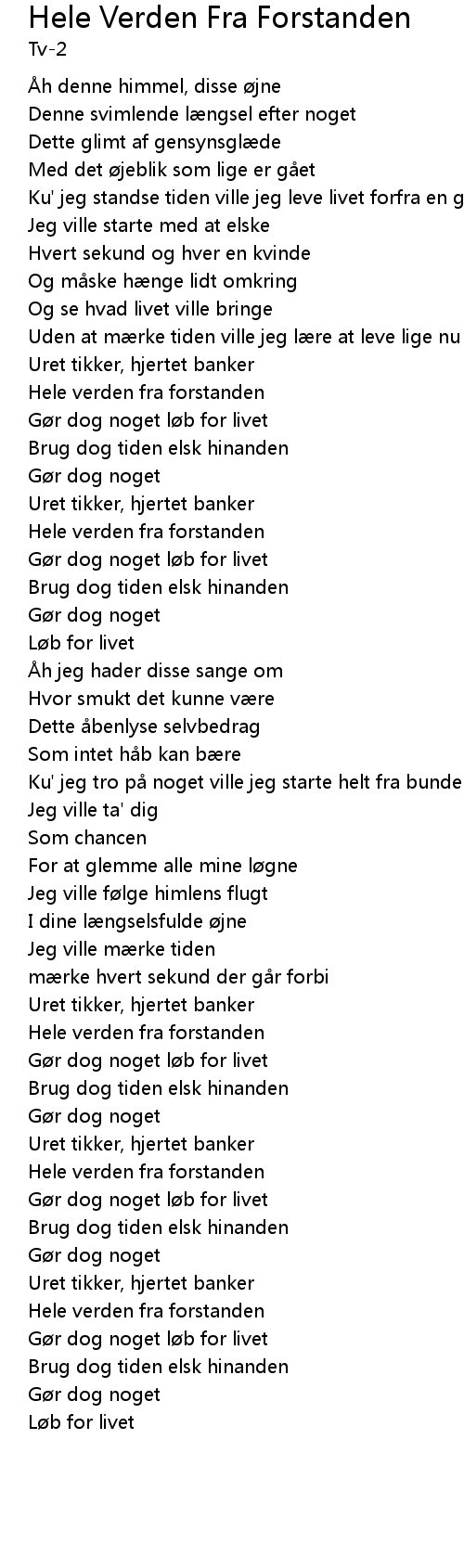 | Song | Hele Verden Fra Forstanden |