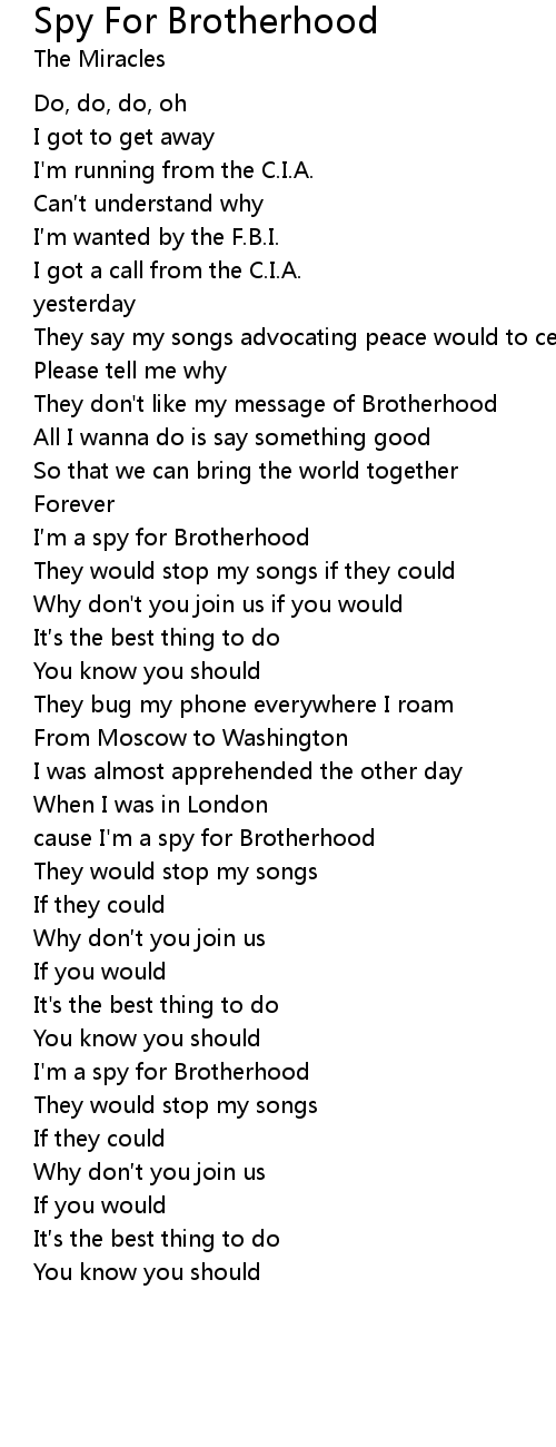 | [01:47.765] | cause I' m a spy for Brotherhood |