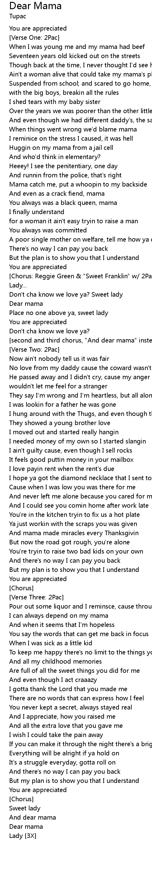 [second and third chorus, "And dear mama" instead of "Dear mama"] |