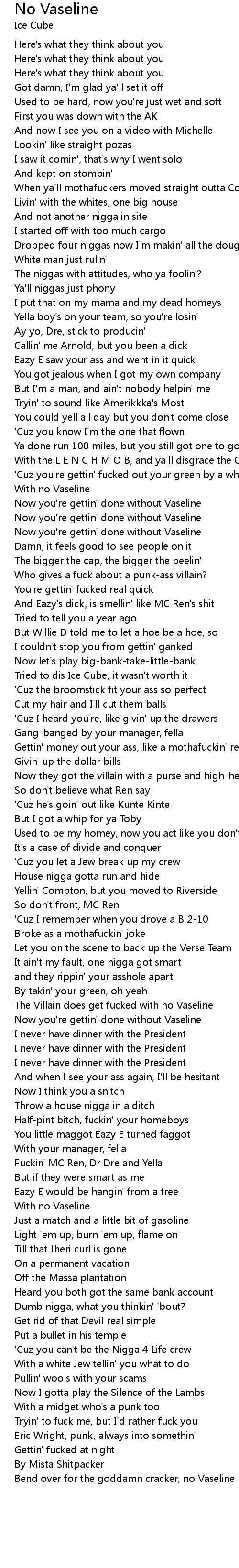 Bend over for the goddamn cracker, no Vaseline |