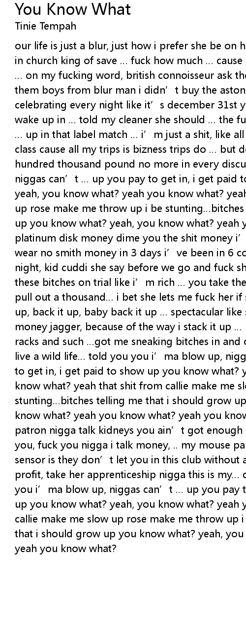 | our life is just a blur, just how i prefer she be on her knees, but she ain’t in church king of save … fuck how much … cause asking if i’m rich though … on my fucking word, british connoisseur ask them boys from coldplay, ask them boys from blur man i didn’t buy the aston, cause when i speed it’s… celebrating every night like it’s december 31st you fools is stuck in april, wake up in … told my cleaner she should … the fucking hoover on the table … up in that label match … i’m just a shit, like all my flights is bizness class cause all my trips is bizness trips do … but don’t do nothing a hundred thousand pound no more in every discussion told you you i’ma blow up, niggas can’t … up you pay to get in, i get paid to show up you know what? yeah, you know what? yeah you know what? yeah that shit from callie make me slow up rose make me throw up i be stunting…bitches telling me that i should grow up you know what? yeah, you know what? yeah you know what? yeah you know what? platinum disk money dime you the shit money i’m trying to get that … then i wear no smith money in 3 days i’ve been in 6 countries i hustle hard, day and night, kid cuddi she say before we go and fuck she wanna sniff something i got these bitches on trial like i’m rich … you take them out… call me… i pull out a thousand… i bet she lets me fuck her if she with something back it up, back it up, baby back it up … spectacular like she from africa move my money jagger, because of the way i stack it up … money up, on money racks on racks and such …got me sneaking bitches in and out the back of club said i live a wild life… told you you i’ma blow up, niggas can’t … up you pay to get in, i get paid to show up you know what? yeah, you know what? yeah you know what? yeah that shit from callie make me slow up rose make me throw up i be stunting…bitches telling me that i should grow up you know what? yeah, you know what? yeah you know what? yeah you know what? i’m on that henney and patron nigga talk kidneys you ain’t got enough stamina to fuck with me fuck you, fuck you nigga i talk money, .. my mouse party like i don’t know what a sensor is they don’t let you in this club without a membership donald trump profit, take her apprenticeship nigga this is my… dope expensive shit told you you i’ma blow up, niggas can’t … up you pay to get in, i get paid to show up you know what? yeah, you know what? yeah you know what? yeah that shit from callie make me slow up rose make me throw up i be stunting…bitches telling me that i should grow up you know what? yeah, you know what? yeah you know what? yeah you know what? |