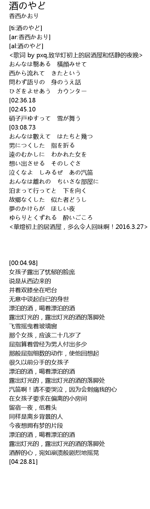 | [00:04.98] | <歌词 by pxq,致华灯初上的居酒屋和恬静的夜晚> |
