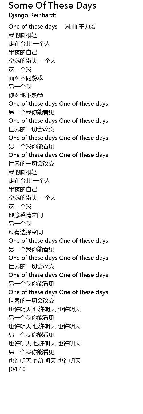 | [00:00] | One of these days cí, qū: wáng lì hóng |