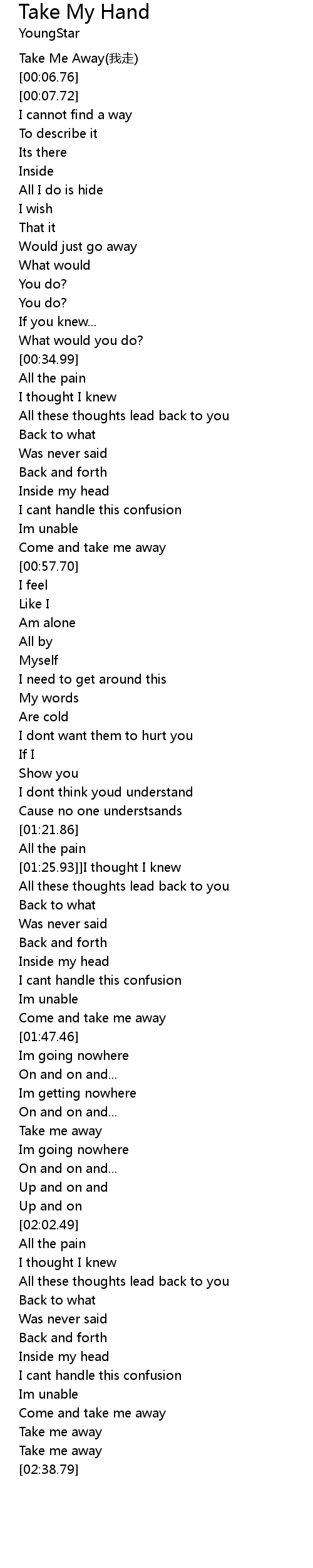 | [00:03.55] | Take Me Away wǒ zǒu |