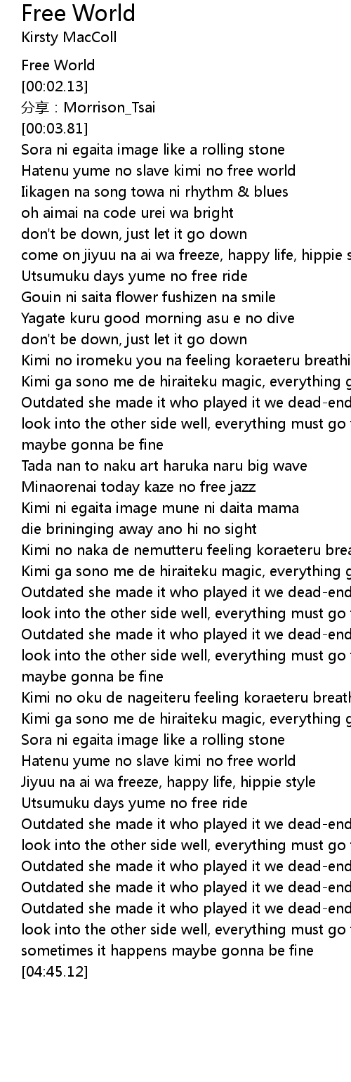| [00:13.23] | Hatenu yume no slave kimi no free world |
