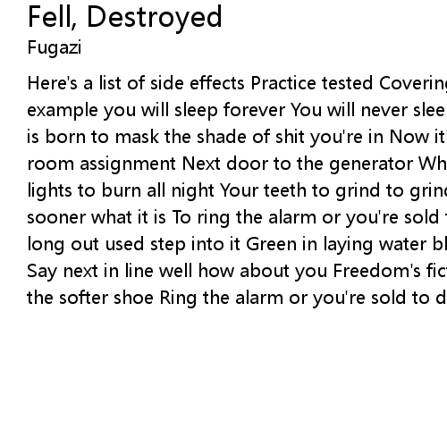 Here's a list of side effects Practice tested Covering every malice angle For example you will sleep forever You will never sleep again Yawn to yawn your face is born to mask the shade of shit you're in Now it's time to fake resignment room assignment Next door to the generator What the fuck it is Whatever powers lights to burn all night Your teeth to grind to grind so fine You'll find out sooner what it is To ring the alarm or you're sold to dying Fell, destroyed and long out used step into it Green in laying water blue Cop a feeling coprophagics Say next in line well how about you Freedom's fiction sorry fifteen time to sell the softer shoe Ring the alarm or you're sold to dying (respects to tenor saw) |