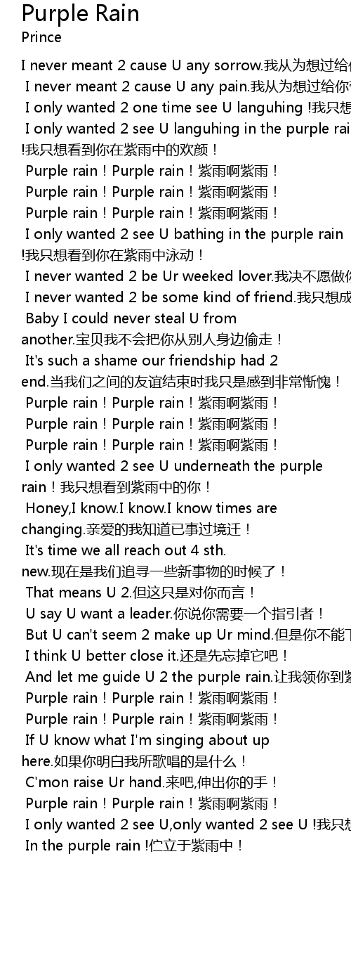 | I only wanted 2 see U underneath the purple rain! wǒ zhǐ xiǎng kàn dào zǐ yǔ zhōng de nǐ! | |