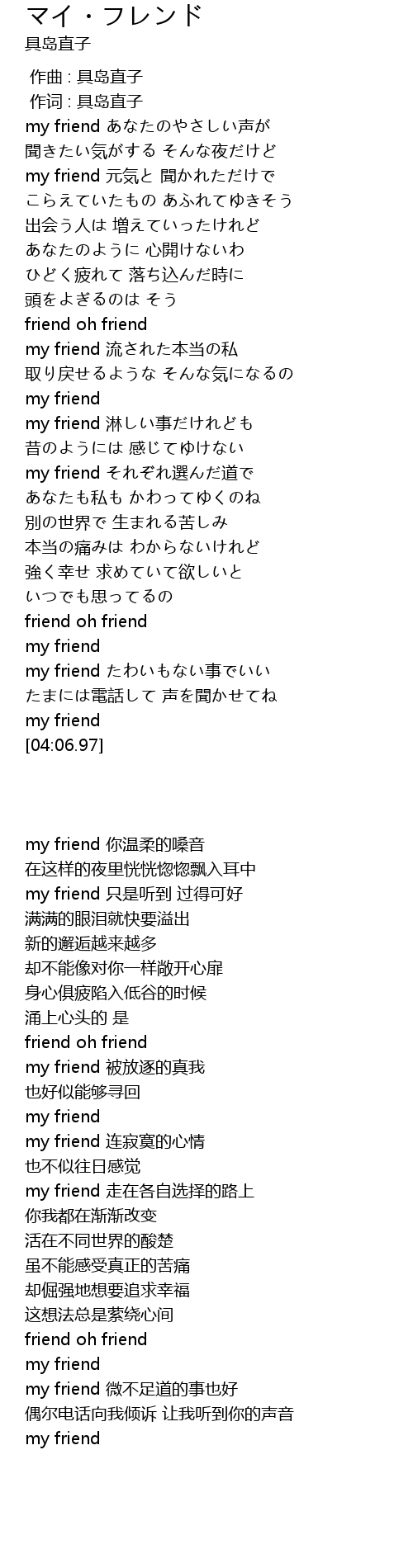 | [02:05.06] | my friend それぞれ選んだ道で |