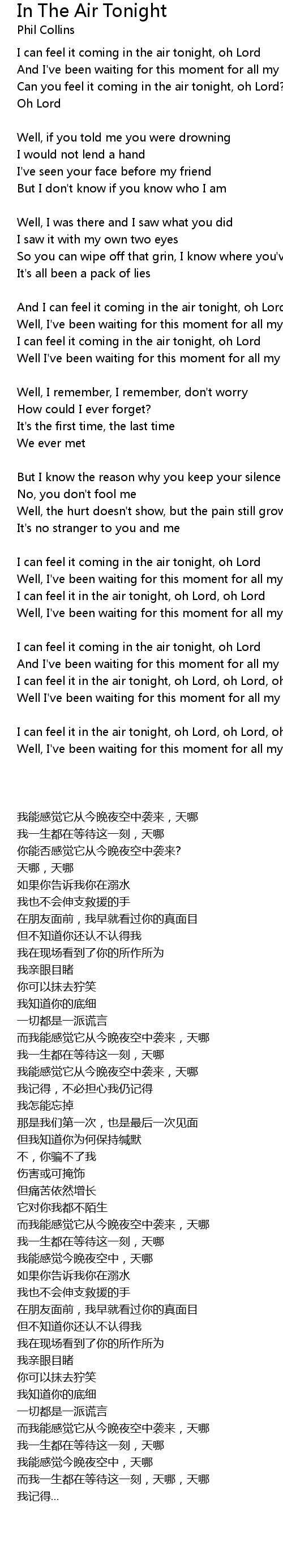 I can feel it in the air tonight, oh Lord, oh Lord, oh Lord |